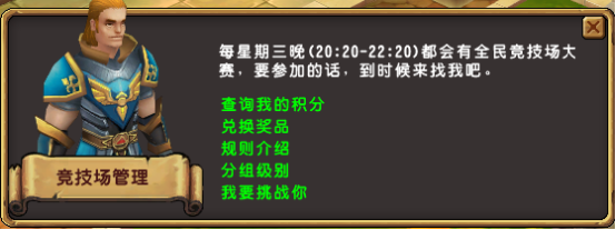 找到新叶城(134,59)的竞技场管理进行报名,比赛的准备时间为20:00—20:20,在20:20之前都可以进入竞技场,超过20:20将不能入场。选择进入竞技场后系统会按照玩家等级自动分配组别,竞技场内不能升级。